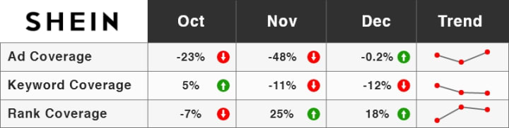 The table below shows the month-to-month changes on the coverages for SHEIN. It shows that SHIEN had been steadily improving its average rank in November and December while losing keyword coverage and ad coverage during the same period.