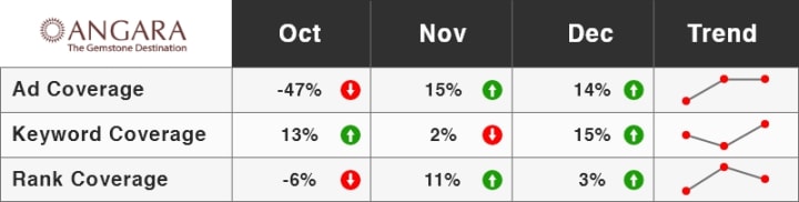 Like Kay Jewelers, Angara.com also had an improvement on all three coverages with a 3% increase in average ad rank, a 14% increase in ad coverage, and a 15% increase in keyword coverage.