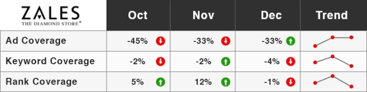 Similarly, Zales’ ads seemed most volatile amongst the top 5, with a -33% decrease in ad coverage, -4% decrease in keyword coverage, and a -1% decrease in rank coverage in December.