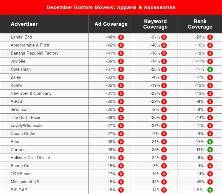 Below are our Top 20 Movers and Top 20 Bottom movers Report for the Apparel & Accessories category for December from our Search Intelligence tool. Please note that the report below considered total percentage change, while the top 5 advertisers above are selected based on the number of ad impressions recorded. Search Intelligence allows you to analyze competitors based on various static and dynamic dimensions like top advertiser by ad impression, region, device & more.