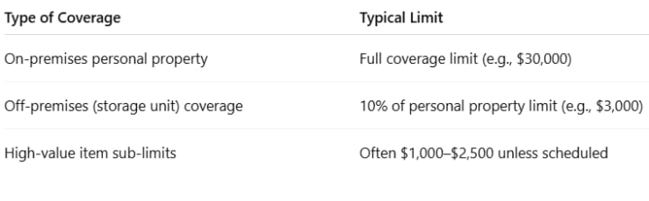 However, this coverage is typically limited to a percentage of your total personal property coverage—often around 10%. So, if your policy provides $30,000 in personal property coverage, your stored belongings may only be covered up to $3,000.