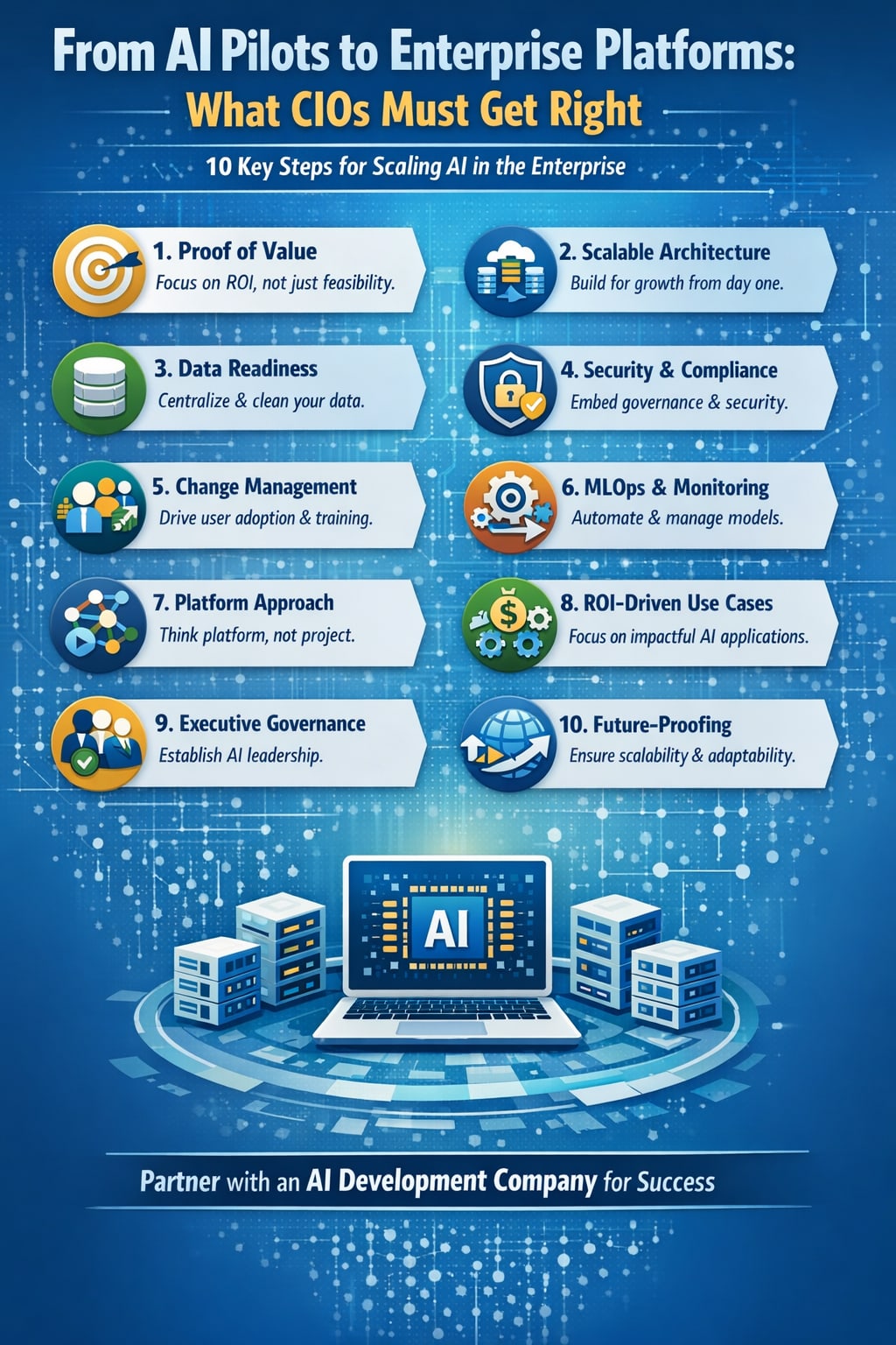 A strategic blueprint for CIOs to scale AI pilots into secure, ROI-driven enterprise platforms through strong architecture, governance, and AI development services partnerships.