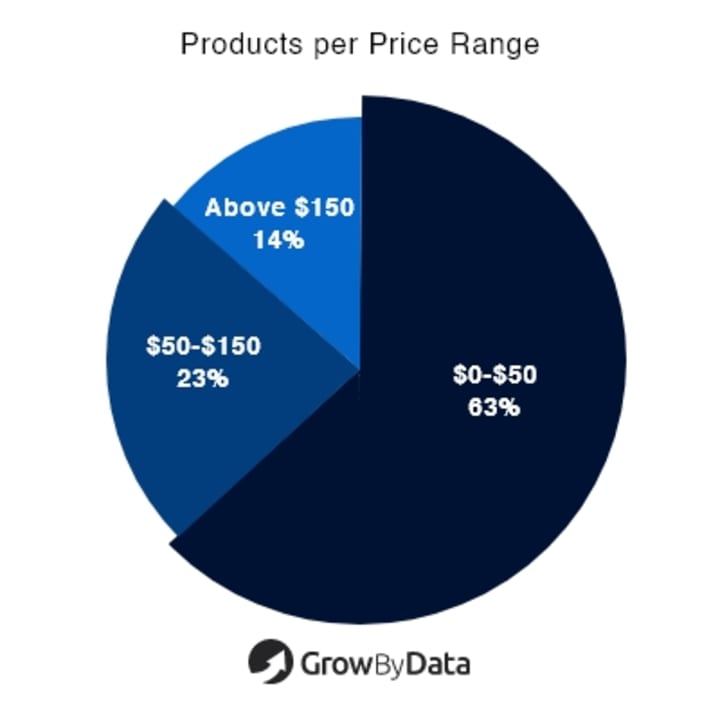 The chart below for Health & Beauty category shows the highest percentage (63%) of the products were in the price range of $0-$50 and the least percentage (14%) of the products were in the price range above $150. Seeing that an overwhelming percentage of the products are priced under $50 and only a small percentage of products were priced above $150, this information can be taken into consideration by retailers for targeting which product they want to advertise on Google Shopping.