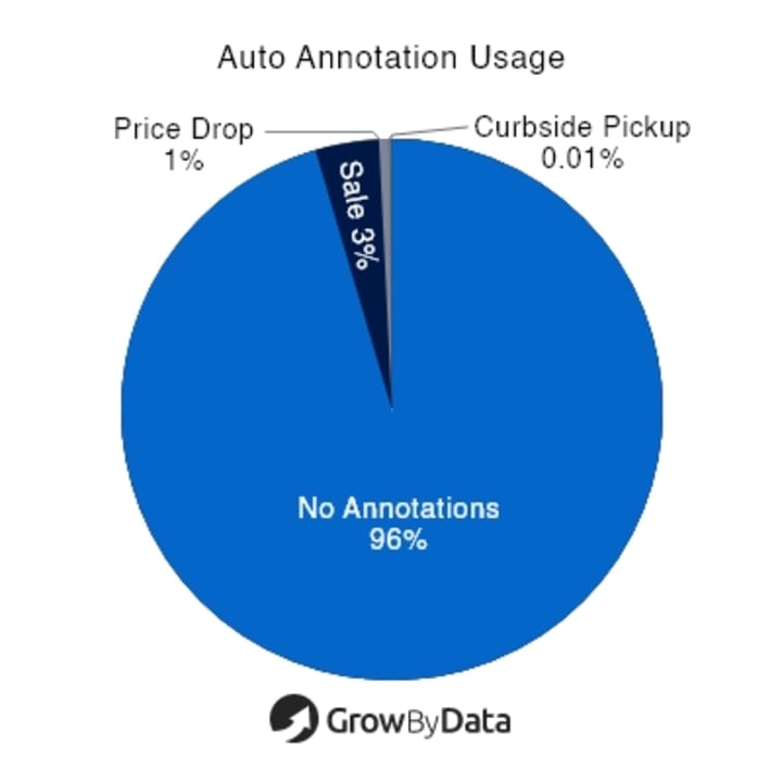 For the category Health & Beauty, we looked into the top auto annotations used on ads and found that annotations such as ‘sale’ and ‘price drop annotations’ were the most frequently used. ‘Curbside pickup’ was also used on some ads. 3% of ads had the ‘sale’ annotation and 1% of ads had the ‘price drop’ annotation. This is potentially an area of opportunity that Health & Beauty product advertisers can focus on to increase their visibility.