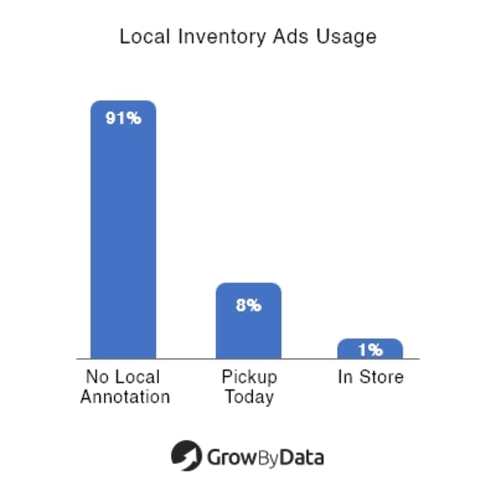 Further analyzing the data, we found only 9% of the ads had local inventory labels on them. 8% of the ads were using ‘Pick up today' and only 1% had the ‘In Store’ inventory label. This is another area where advertisers can focus on to stand out and beat the larger big box stores by targeting more local and nearby customers.