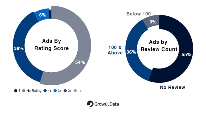 For ratings and reviews, the Health & Beauty category had 39% of ads with rating scores of more than 4, but only 6% of ads had a rating score of more than 3 on Google Shopping. Looking at the review count data, we found that 36% of the ads had more than 100 reviews and 9% of the ads had less than 100 reviews.