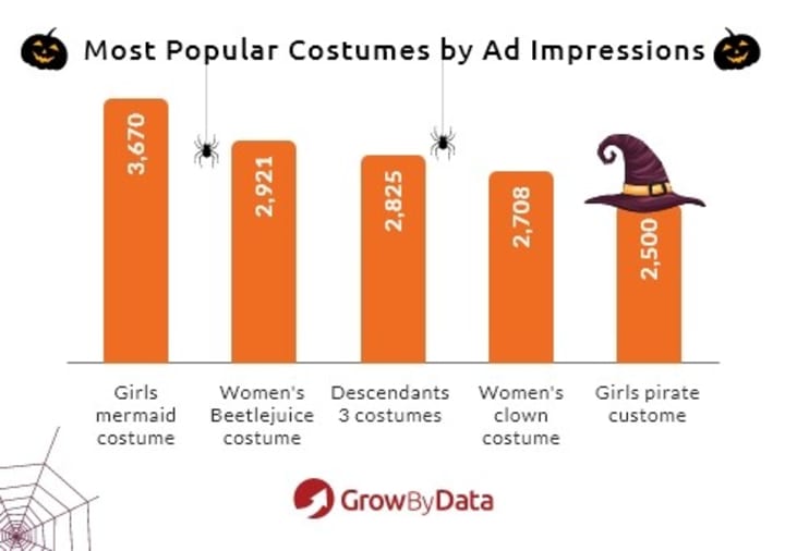 The most sought after costume this Halloween seems to be the mermaid, with 3,670 ad impressions, followed by the Beetlejuice costume with 2,921 ad impressions. 78% of the impressions came from mobile devices and only 22% from desktops.