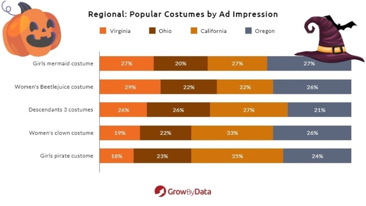 Looking into the most popular costumes in each of the 4 states, we found women’s clown costumes and girls pirate costumes to be popular choices in California. Women’s Beetlejuice costumes seem to be a popular choice in Virginia.