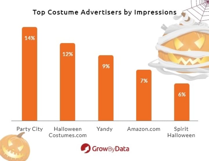HalloweenCostumes.com seems to be the go-to site for costumes over the past few weeks, receiving 13% of impressions, followed by Party City with 10%. Amazon.com, Target, and Walmart round out the top 5.
