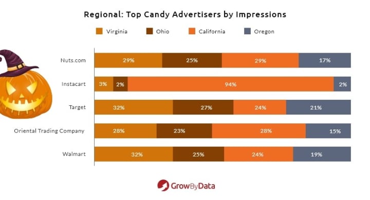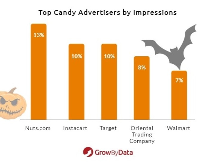 Surprisingly, once again, large online retailers like Amazon, Walmart, and Target are not getting the most ad impressions on Halloween candy-related keywords. The top spot belongs to Nuts.com, receiving 13% of the ad impressions, followed by Instacart and Target with 10% of the impressions each. Oriental Trading Company has 8% of the ad impressions and Walmart 7%, to close out the top 5.
