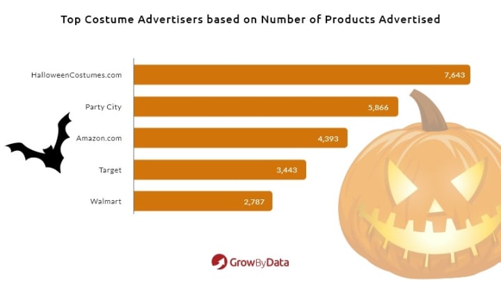 This Halloween season has certainly been different compared to previous years, amidst the COVID19 pandemic. In our most recent blog post, we analyzed retailers with the most aggressive pricing strategies for costumes and candies. For our next analysis, we’ve ranked the top ads for costumes and candies. Using GrowByData Ad Intelligence solution, we collected and analyzed the Halloween shopping ads data of 1,282 highly competitive broad-match type opportunity keywords for Halloween costumes and candies with a monthly search volume of up to 25 Million (per Google’s Keyword Planner). The product information and ad data were collected daily from October 6th to October 28th, from 4 states in the US – Virginia, Ohio, California, and Oregon.