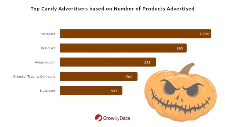 Our data showed Instacart as the store to go to find the most candy options. Instacart is advertising 1004 different products, followed by Walmart with almost 900 different candy products.