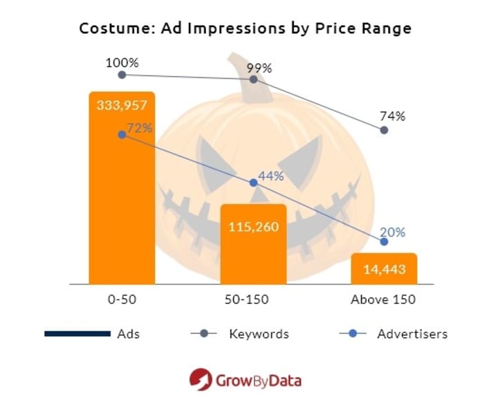 Our data showed 72% of ads were for costumes in the $0-50 price range. Only 3% of the ads were found for costumes over $150. We also found that 72% of advertisers for costumes were also seen competing for ads under the $50 price range. Almost 100% of keywords were seen on ads of products below $150.We also discovered that almost 40% of the ads impressions for products over $150 were coming from Oregon and the least impressions in this range was from Ohio, at only 16%.