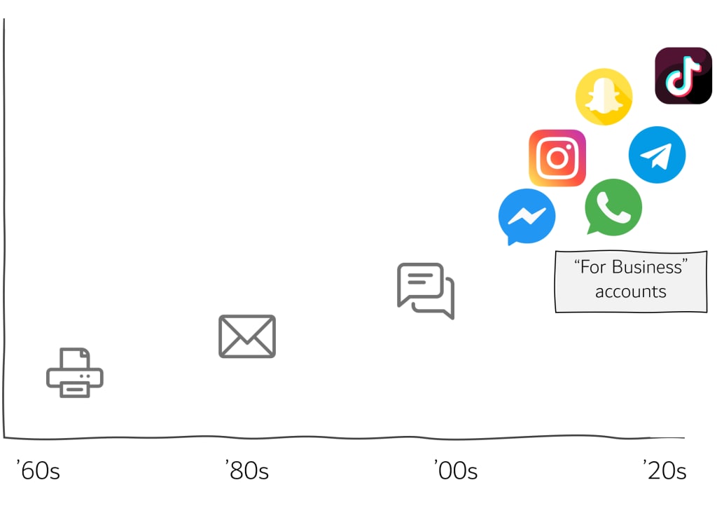 Around the 2000s live chat for websites was introduced, which was quite revolutionary in the way that customers communicate with brands. Moving forward a few years to 2010, we had the era of social media kicking in. The number of messaging channels expanded rapidly, followed up by a period of “for Business” accounts in the last few years. This enabled businesses to have 1–1 communication with their customers via social platforms.