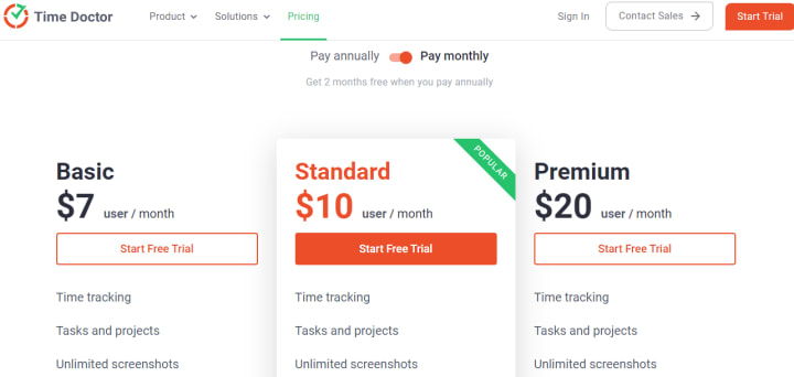 Time Doctor offers a 14- days free trial period, after this time passes, users can choose then choose the pricing that suits them. The pricing is structured into Annual or monthly payments.