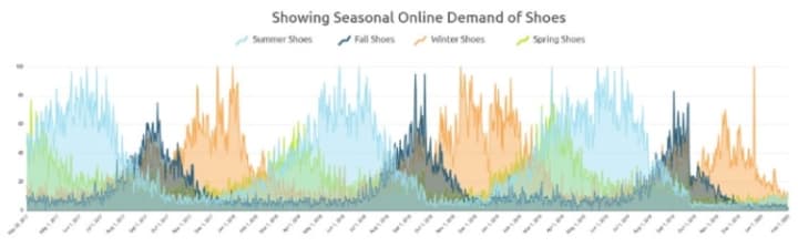 This is a crucial step to understanding what keywords to run Google Shopping ad campaigns on during a certain time of year, month, or day. Marketing Intelligence analyzes the keyword demand trends and helps you optimize your visibility by providing insights on the right keyword to spend on during the optimal time to maximize your ad spend. For example, the graph below shows the different seasonal trends of various shoe types. Ad campaigns should be run accordingly to maximize Google Shopping ROAS.
