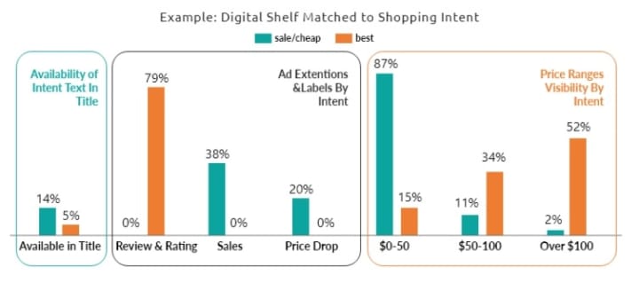 To maximize ROAS on Google shopping, your visibility across the shopper journey is imperative. As a brand, showing up on the interest, consideration, and conversion stage keywords increase your chances of winning sales, thus optimizing your ROAS. The table below shows that if there are attributes like sale/cheap on the search then over 85% of the listings were in the lower price range ($0-$50) but searches with best had only 15% of the listings in this range and over 50% of the listings were in the highest price range.