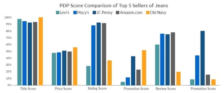 Product Intelligence analyzes your ads as well as your competitors and provides you a score for each product attribute. Use these scores to improve your product contents that are falling behind to improve your product experience and optimize ROAS. The images below show the PDP (product detail page) scores of the top 5 sellers of Jeans products. Data like this makes it easier to see what content you need improvements on compared to your competitors.