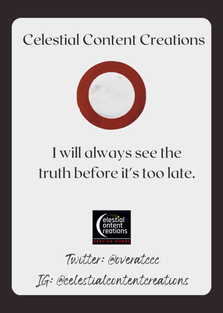 When they say the truth will set you free-- they weren't lying. The key to achieving that freedom, however, is acting on the truth. If you see the truth and purposefully overlook it, then you end up living a lie just the same. Living a lie requires such an exorbitant amount of energy that it soon becomes too difficult to focus on your soul’s mission. You begin to stray. Once that happens, you’re ensnared in the same mental prison as the folks who are manipulating you.