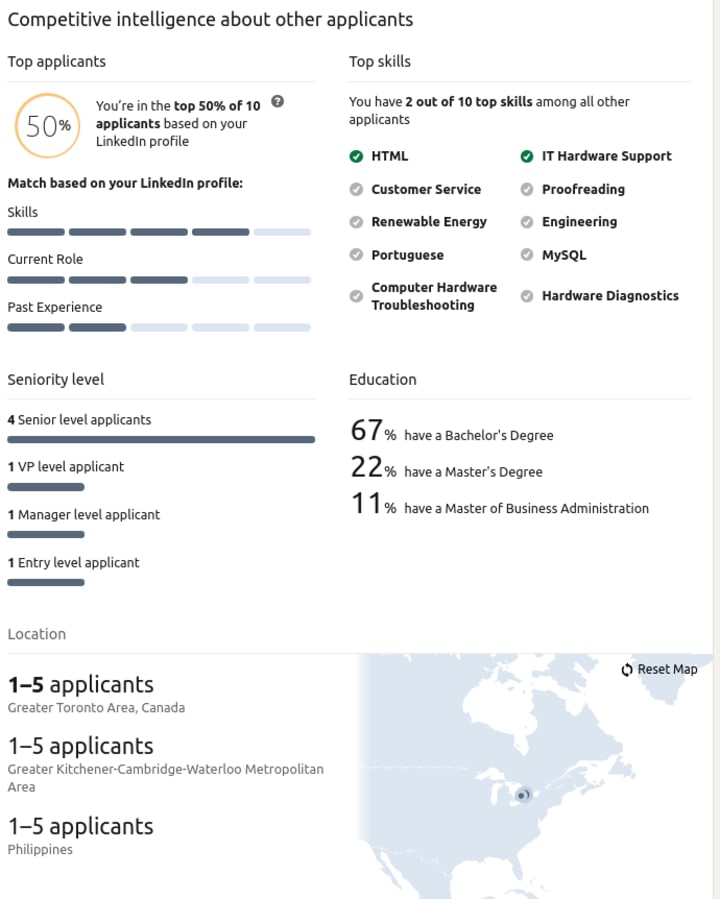 LinkedIn Premium members have access to additional job posting statistics such as how qualified they are compared to other applicants, which of their skills matched the job posting’s requirements and the education of the applicants. This is my favourite premium feature as it is good for finding how competitive a job posting is and how you would fare if you were to apply to it. Even if you are not interested in a job posting, this is a nice way to gauge how hire-able you are in a field and what skills are in demand.
