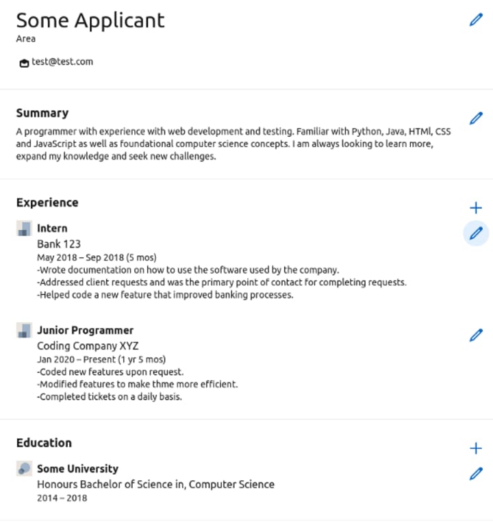 Although resume creation was quick and editing content was simple, I dislike the formatting and the resume that was generated. The image below is what the resume will look like when previewed and downloaded.