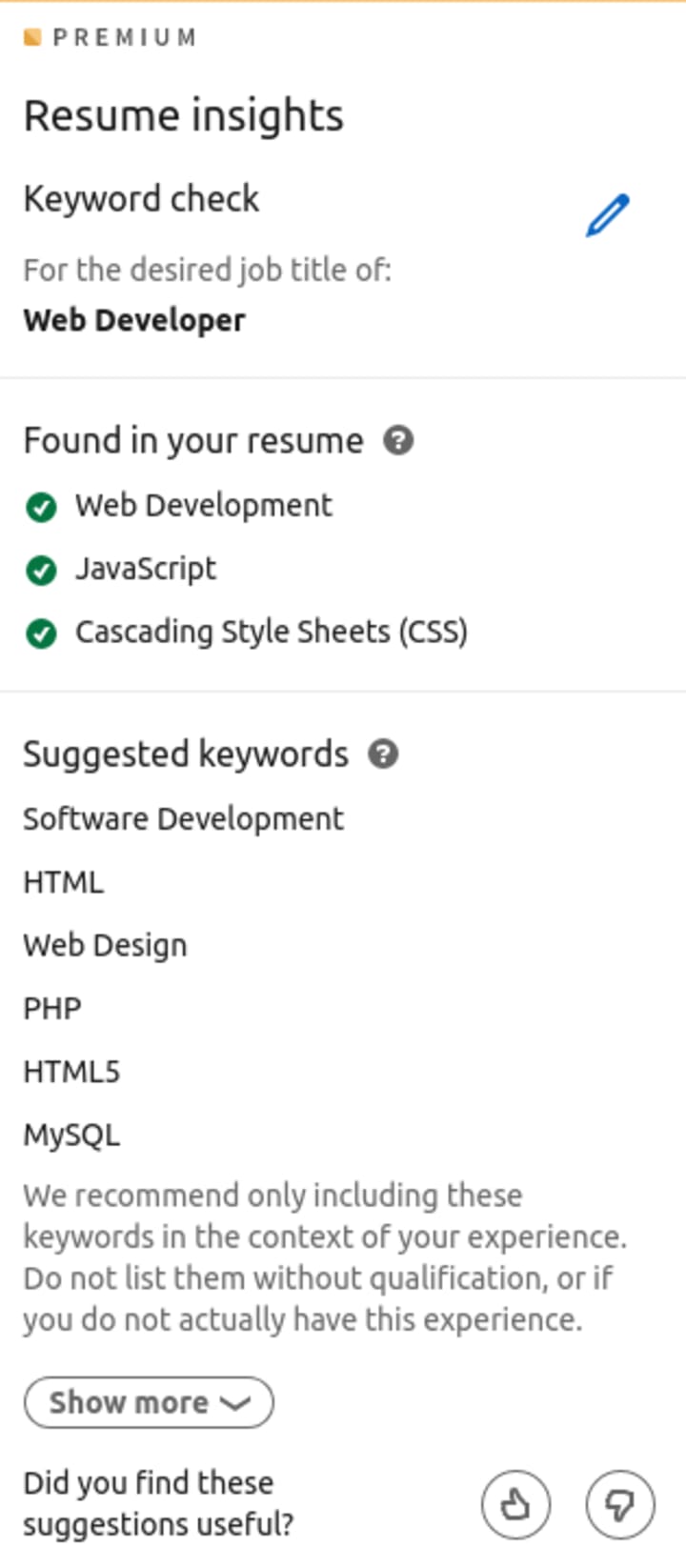There is also a feature where you can input a job title and receive recommended keywords to add to your resume to increase your chances of getting your resume past a scanner.