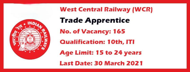 West Central Railway Recruitment 2021: West Central Railway (WCR) invites online application from capable persons to fill up current openings in various trades. WCR has assigned 165 vacancies for Trade Apprentice posts for the year 2020-21. From West Central Railway Trade Apprentice recruitment 2021 notification, link for online form will be activated from 01.03.2021 at www.wcr.indianrailways.gov.in/ mponline.gov.in. Class 12th/ ITI job seekers can use this chance to start your career at WCR Bhopal. Before applying, candidates are advised to ensure that they met the eligibility. The Last date to submit the WCR Trade Apprentice online form is 30.03.2021.
