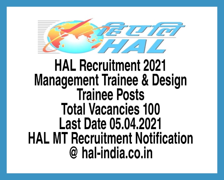 HAL Recruitment | Management Trainee & Design Trainee Posts | Total Vacancies 100 | Last Date 05.04.2021 | HAL MT Recruitment Notification @ hal-india.co.in