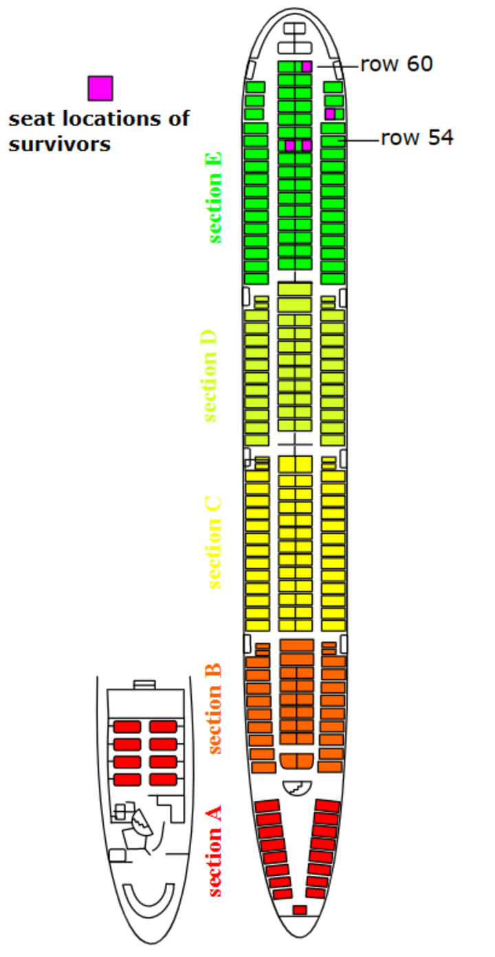 The flight took off from Tokyo's Haneda Airport at 6:12 PM local time, bound for Osaka International Airport. At around 6:54 PM, the aircraft's tail section suffered a catastrophic failure, causing the tail to separate from the rest of the aircraft and the plane to lose control. The aircraft crashed into Mount Osutaka, killing all 15 crew members and 505 of the 509 passengers on board. Only four people survived the crash. The four people who survived were Hiroki Yoshizaki and Mikiko Yoshizaki, a mother and daughter duo, Yumi Ochiai (26), and a flight attendant who was not on duty at the time of the accident, and Keiko Kawakami (12).