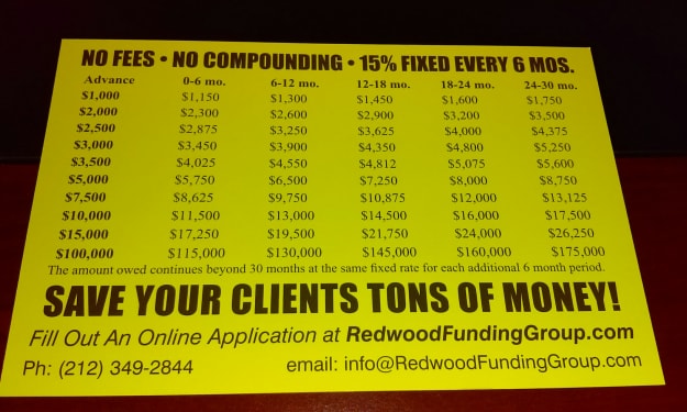 Redwood Funding Group never charges fees and never compounds the interest. One Fixed Rate of 15%. Borrow $1,000, You Owe $150 Every Six Months. That’s It!.