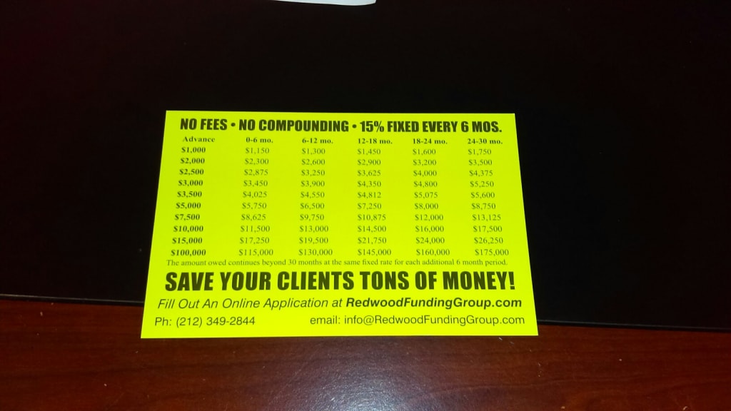 Let us be crystal clear. At Redwood Funding Group there is no compound interest. There is one fixed rate of 15% every six months. So if you borrow $1,000 you owe us $150 every six months you have the money. After one year, that's $1,300. Two years, $1,600. Also, there are no fees in any form whatsoever. We don't masquerade a fee as something else and charge you for it either. Finally, we charge you what the bank charges us for a wire, $30.