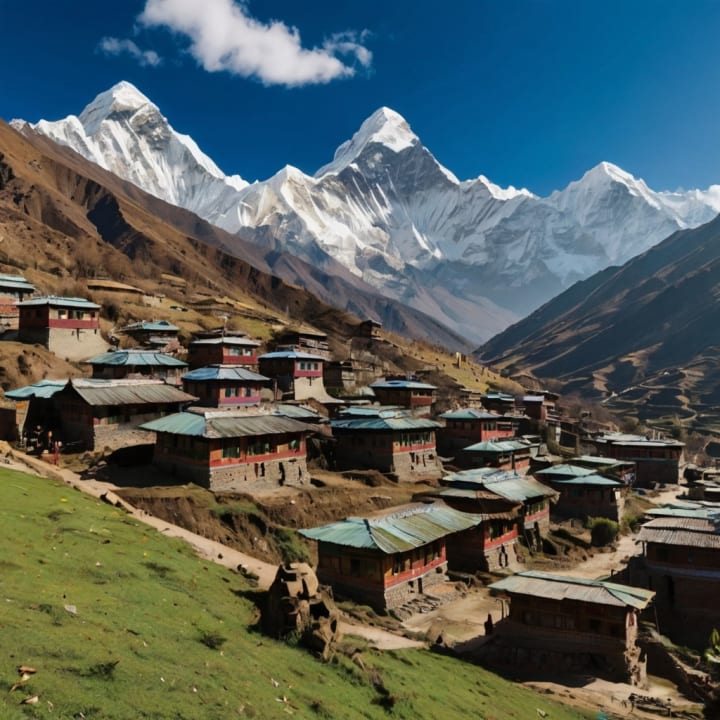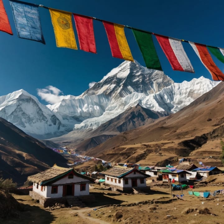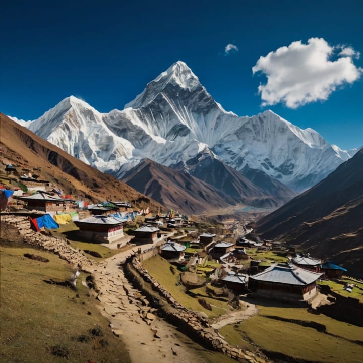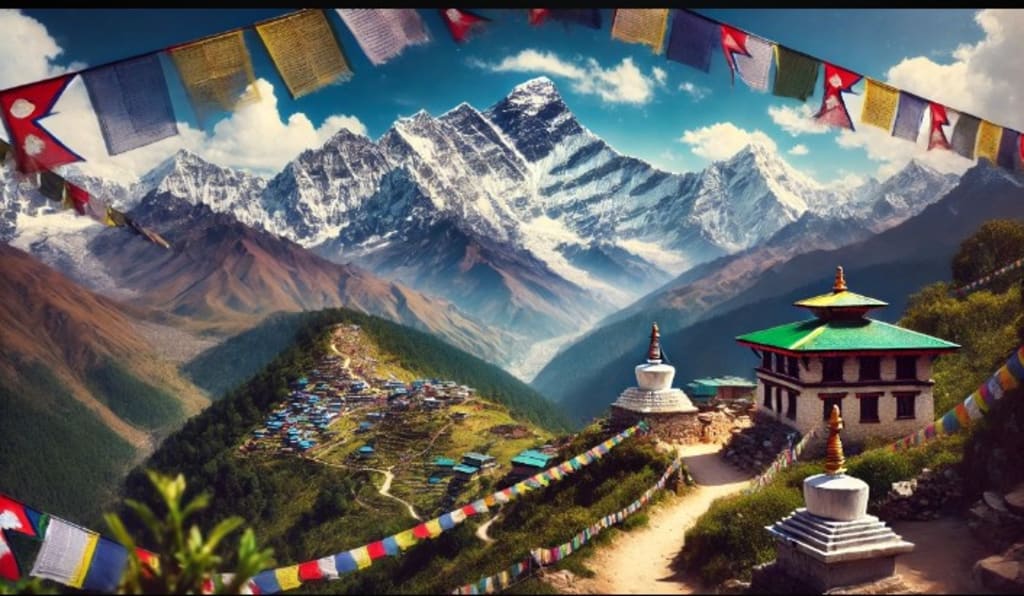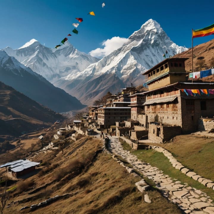 A panoramic view of the majestic Himalayas, showcasing Nepal's snow-capped peaks, including Mount Everest, under a pristine blue sky. The foreground captures a serene trekking trail winding through a lush green valley adorned with traditional Nepalese homes and vibrant prayer flags. This scene epitomizes the harmony of natural beauty, adventure, and rich cultural heritage found in Nepal.
