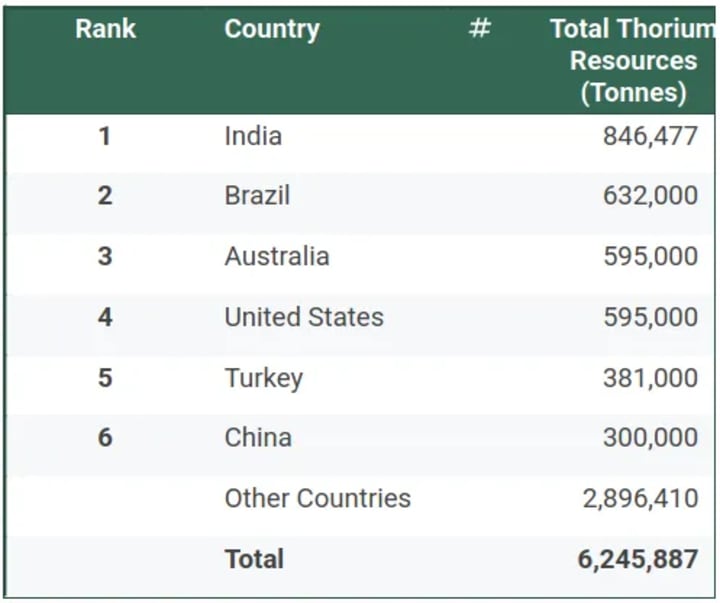 World thorium reserves