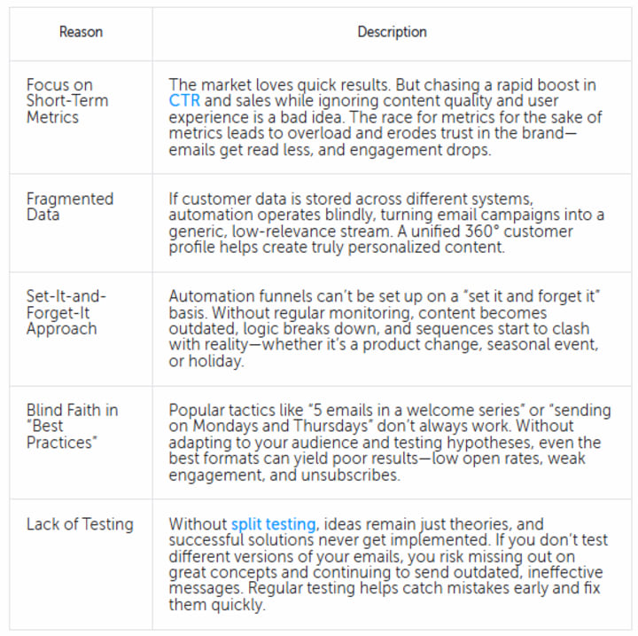 Users are increasingly shifting to messengers, apps, and social media, while many automation flows are still built around traditional email logic. When audience behavior changes but your sequence stays the same, its effectiveness declines.