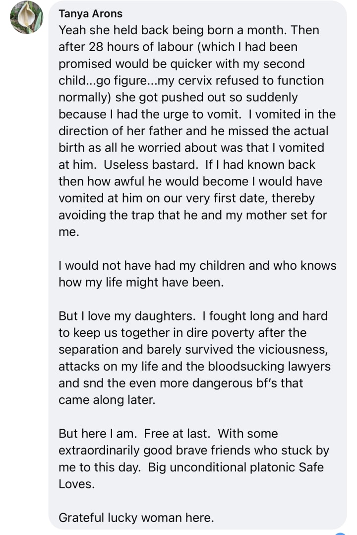 My brave little baby that at 10 years old had to jump on the back of Terry as the prick was strangling me, learned to internalise the trauma and blame me for not providing her with a safe enough, or affluent lifestyle.