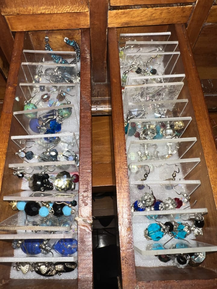 Titanium Woman is sick of struggling for every little thing…alone. But I fought my through. Last evening I cut up little dividers out of stryrofoam for my jewellery drawers on my little apothecary cabinet. So my earrings are more easily manageable.