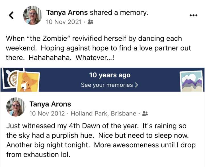 (When “the Zombie” revivified herself by dancing each weekend. Hoping against hope to find a love partner out there. Hahahahaha. Whatever…!)….