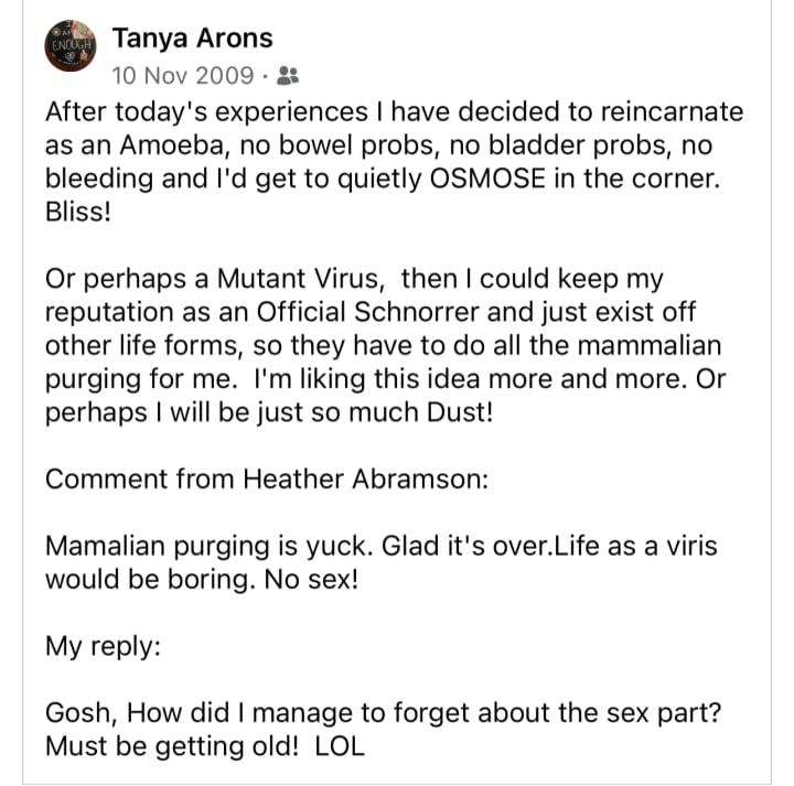 After today's experiences I have decided to reincarnate as an Amoeba, no bowel probs, no bladder probs, no bleeding and I'd get to quietly OSMOSE in the corner. Bliss!