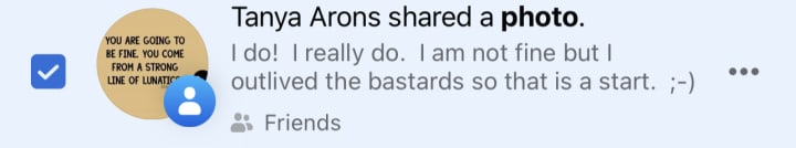 I have another appointment to see her on 13th March. The next available appt was 6 March but I told her that is my arsehole dead father’s birthday that day so I will not be in a good headspace to see anyone on that day. We both laughed. I told her I bet you don’t get too many patients with so many triggers like that.