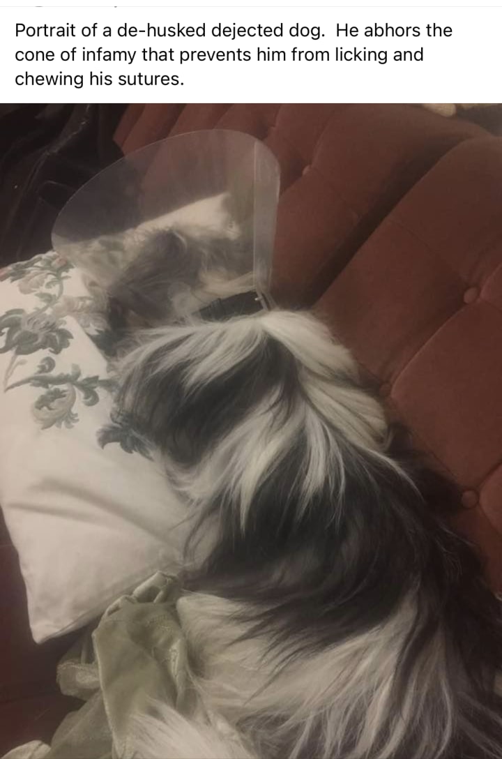 My Beauregard is home. Very wobbly and groggy. I had to put an Elizabethan collar on him as he immediately went to lick his sutures. We go back in 3 days to have his bandages changed on his hind paws. (He had his dew claws removed as well as his testicles!)