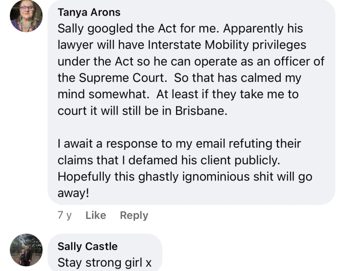Lyn is coming over to comfort me after devastating news about the defamation suit. His lawyer is not licensed to practise law in Qld thereby I will be forced to appear in a NSW court, which they know I cannot financially afford so they hope I fail to appear which would mean the judge would make orders against me without my being heard.