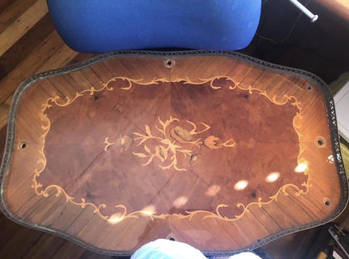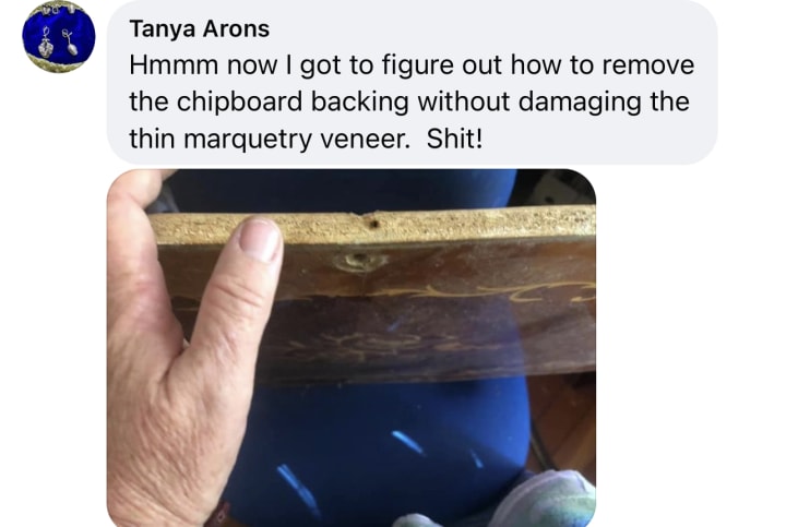 Next project. I am going to unscrew the brass edging from my mother’s broken Italian inlaid drinks trolley. (It broke when Crystal borrowed it for one of her plays. No doubt it was partially broken anyway, with age).