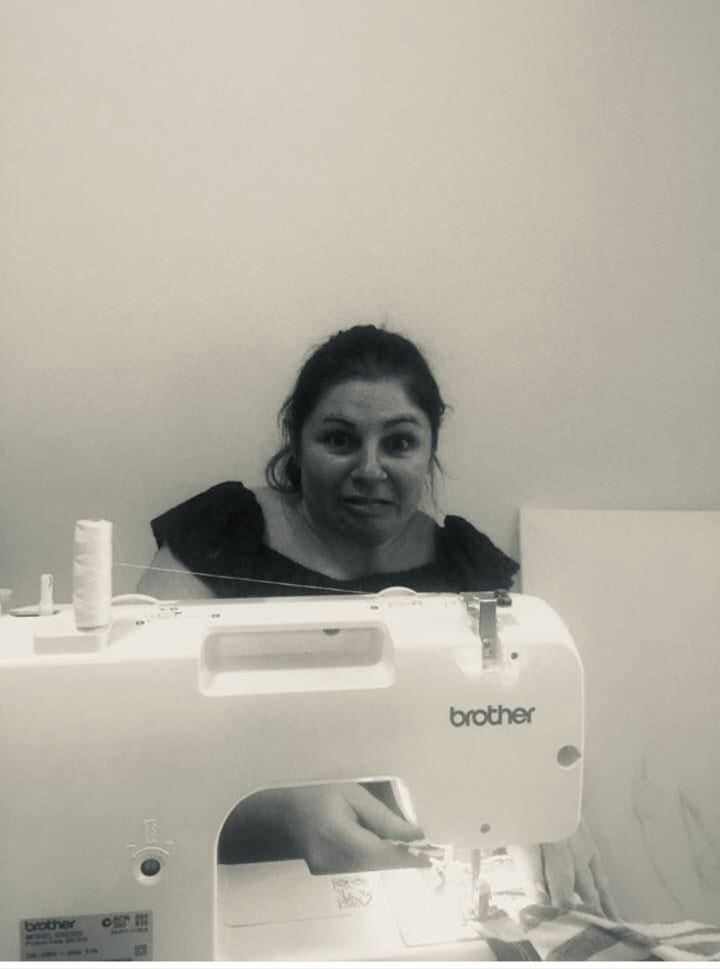 Crystal is in the downtown Brisbane sweatshop! See happy face below! She has happily sewn up four skirts for me. I helped by threading through the elastic!