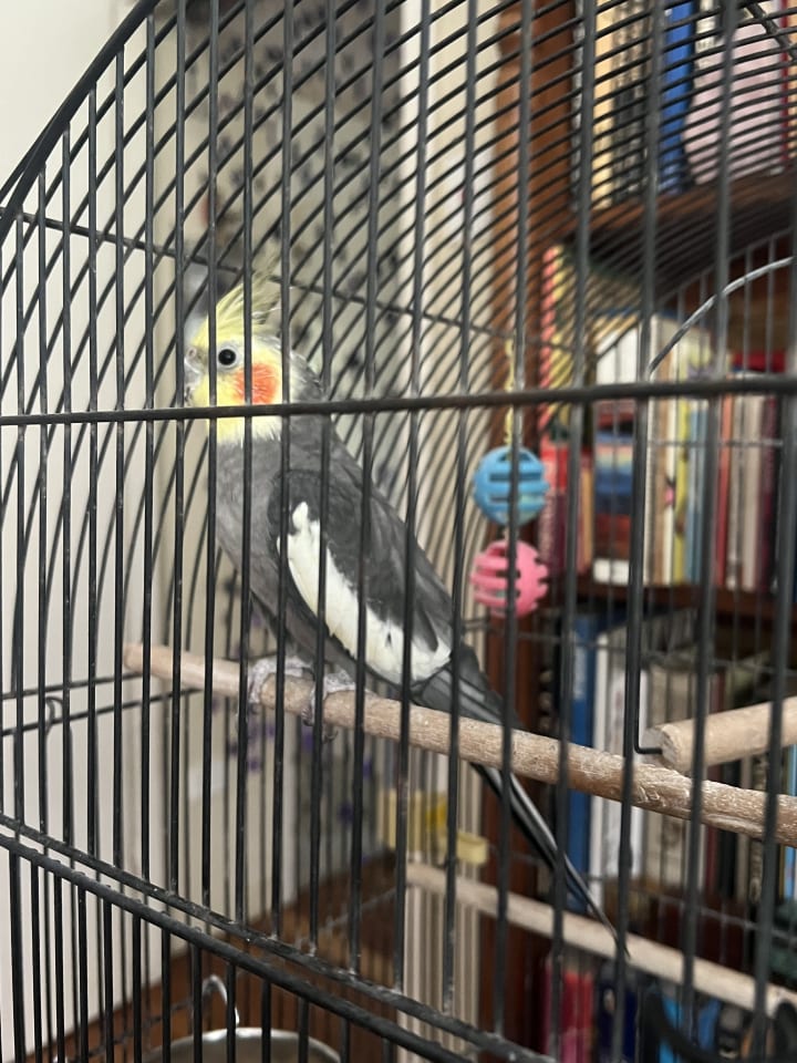 Kermie was so happy when I brought his big cage in. He walked right inside it when I set it up and put his smaller cage next to the doorway. Clever boy. Then he started vocalising and even started playing with his bell I had just given him. Happy Bird….Happy Mama T. Little Beau the cockatiel has a lot of attitude too, just like Beauregard. Delightful!!!