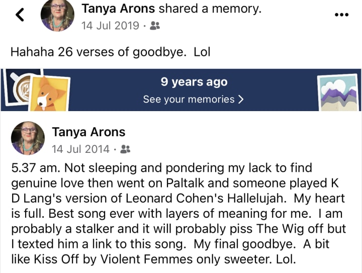 5.37 am. Not sleeping and pondering my lack to find genuine love then went on Paltalk and someone played K D Lang's version of Leonard Cohen's Hallelujah. My heart is full. Best song ever with layers of meaning for me.