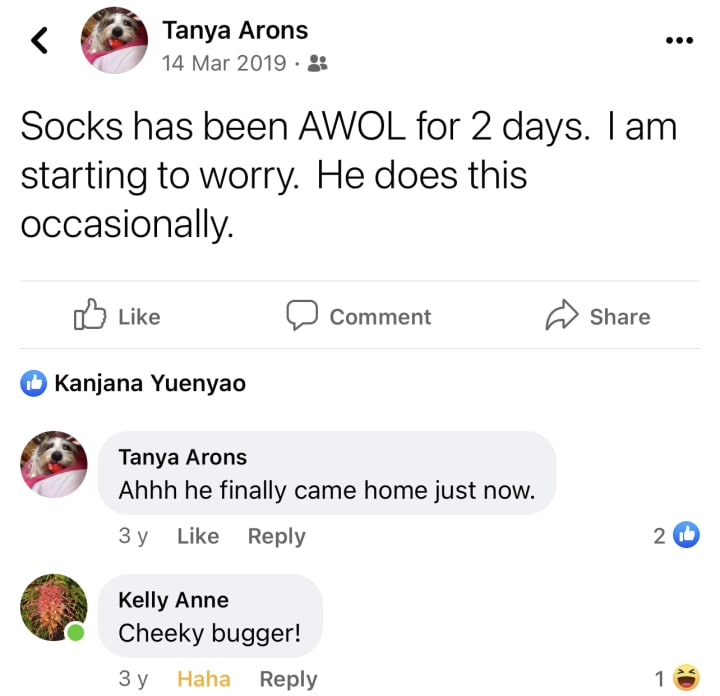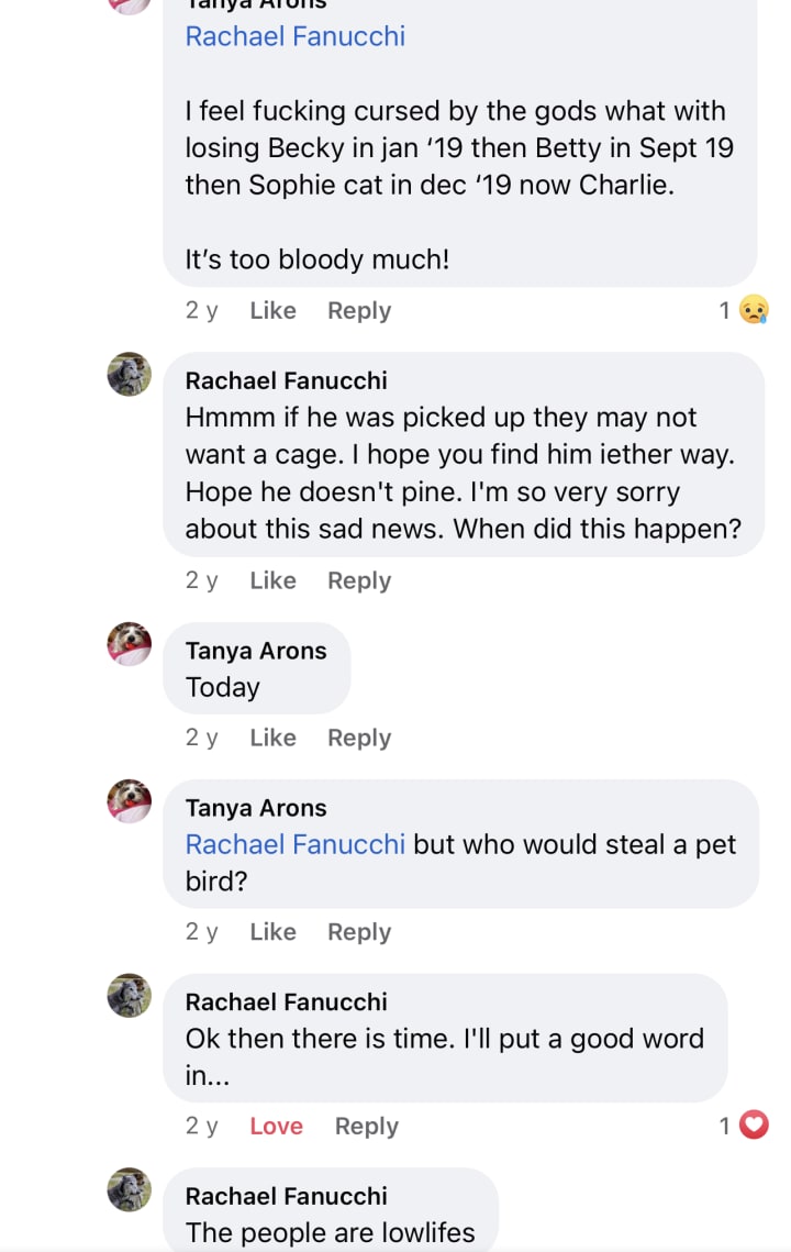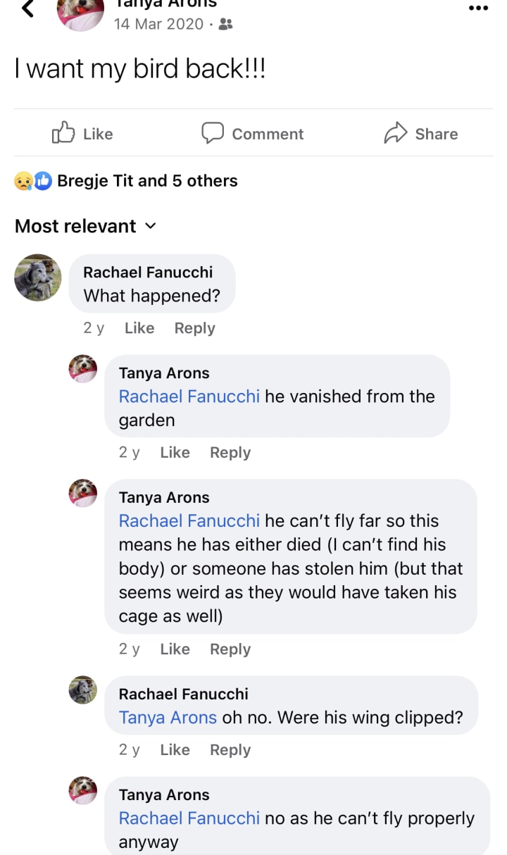 Update 14 March 2021: Charlie came back two days later, found by the Scott family down the road! Back then I still thought Charlie was a boy but on 28 December she lay two eggs so now she is Charley. Weird little magical bird.