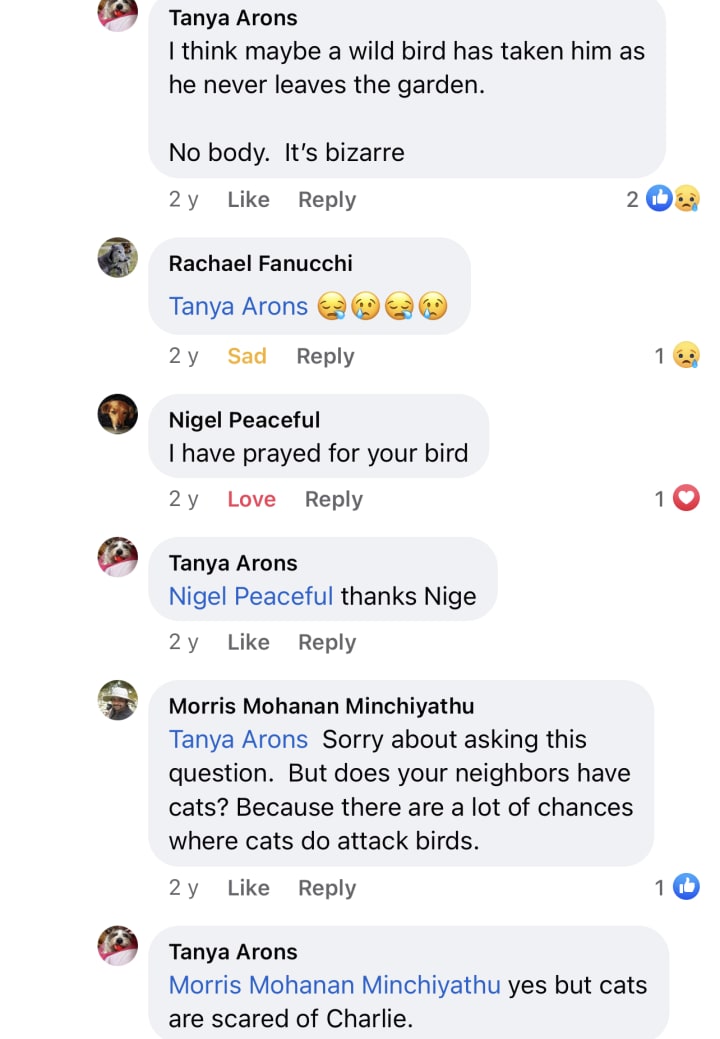 Charlie has gone missing from the garden. I have been calling him and searching under all the trees. He can’t fly so it is alarming as he can’t simply disappear. I have even looked for his body (in the event he got attacked by other birds). No sign of him anywhere.