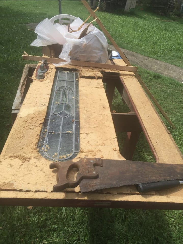 I stored this door under my house for 2 years, hoping to use it as an outdoor table when the other one finished rotting out. But alas and alack, this 'Rosewood' door is made from Chipboard and cardboard. So only the lead light is worth keeping. So I am struggling to remove the second window for repurposing later. Maybe!