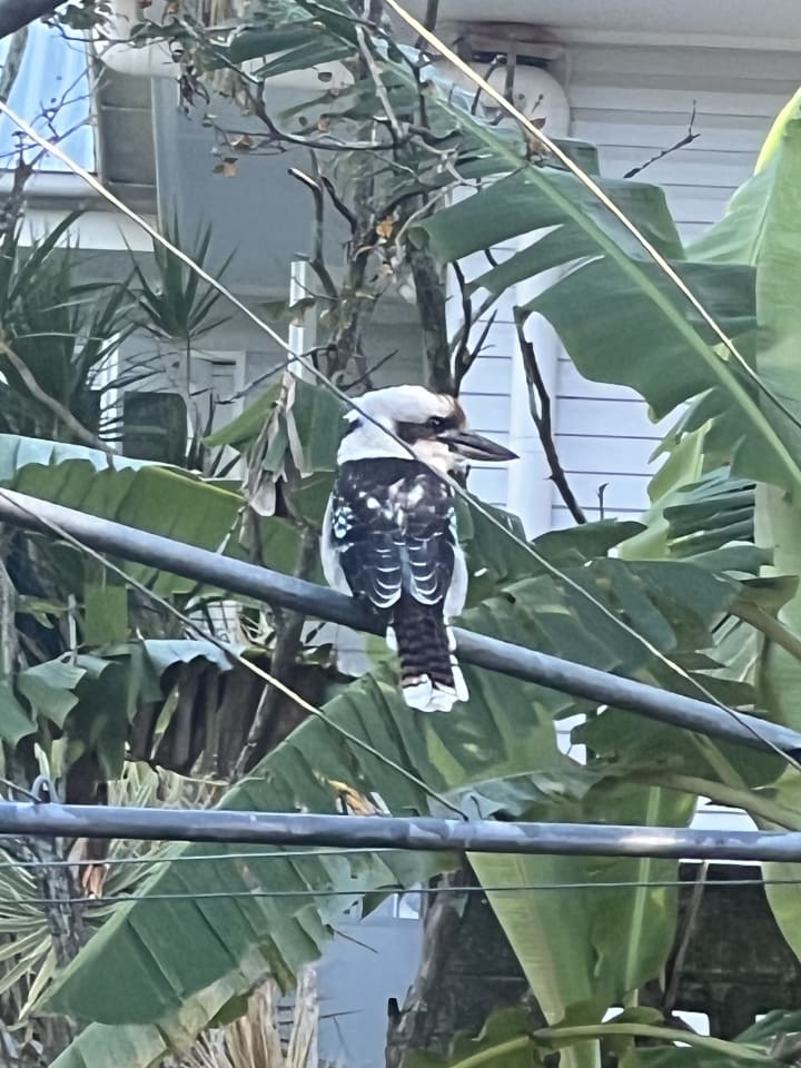 I’m sitting on my back steps, enjoying the morning light and my kookaburra perched on the Hills Hoist, patiently watching me, watching him.