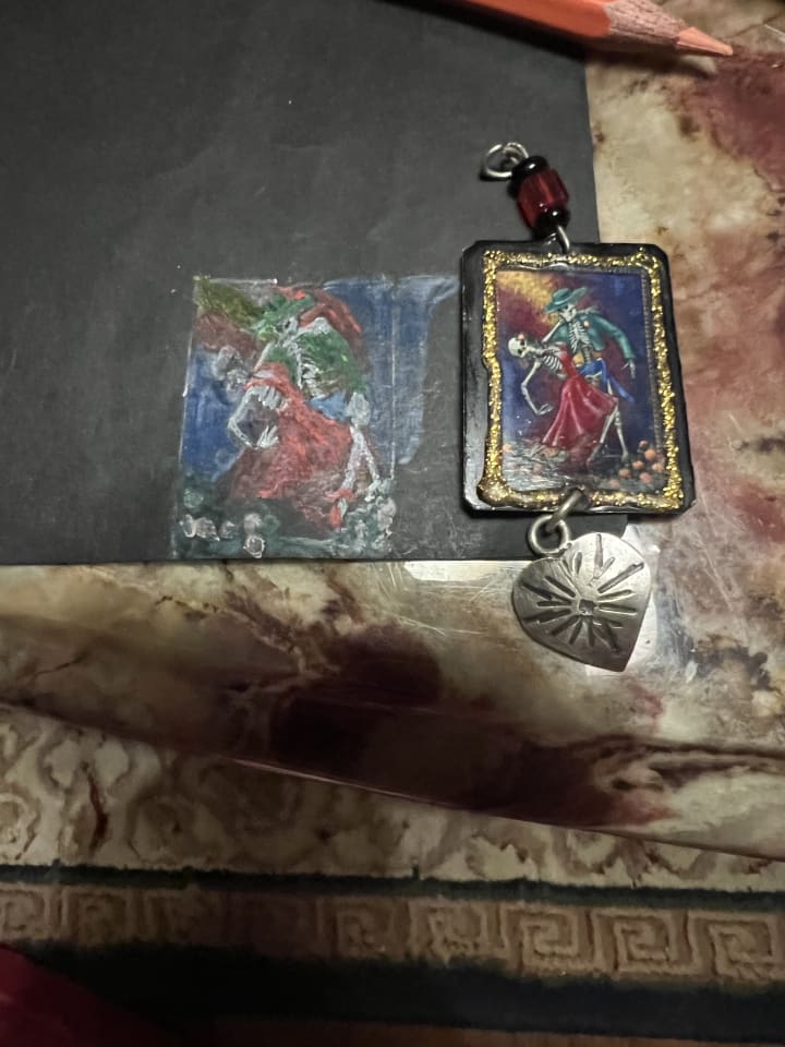 I am trying to replicate my calaca earrings. (I lost one on 14 April 2024 when Jarrod and I went to Byron Bay) I would Love to have this made as enamelling on silver or copper but the enamelling paints are expensive and I don’t have a kiln. I think they can be fired with a torch though.